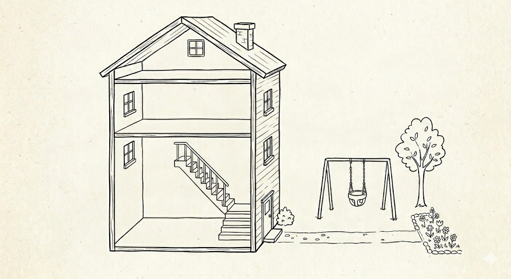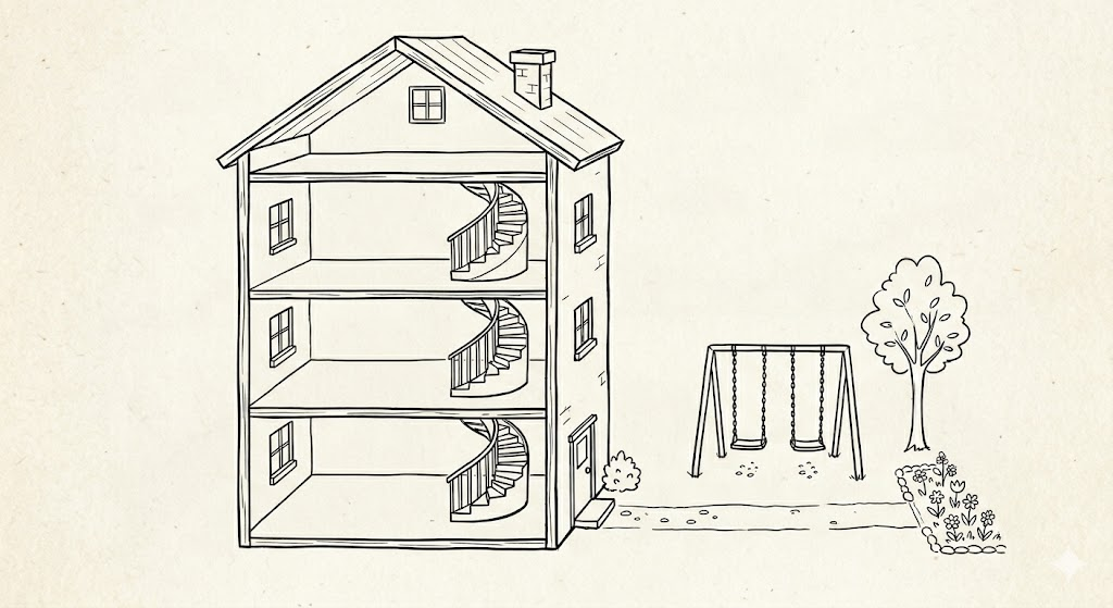 Let’s say you’re building a house, and you have an architect draw up some plans. You want a three story house with a grand spiral staircase, and a swingset in the backyard with two swings. Something like this: